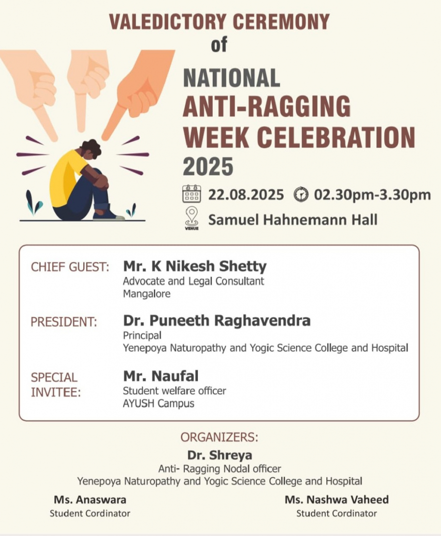Yenepoya Naturopathy & Yogic Science College & Hospital, Mangalore, observed the National Anti-Ragging Week 2025 with various awareness activities and competitions promoting a safe and respectful campus environment.