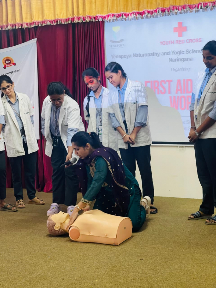 The Youth Red Cross (YRC) Unit of Yenepoya Naturopathy and Yogic Science College & Hospital (YNYSCH) organized a First Aid Awareness Workshop on 29th September 2025 to educate students and staff on essential life-saving techniques and emergency response procedures.