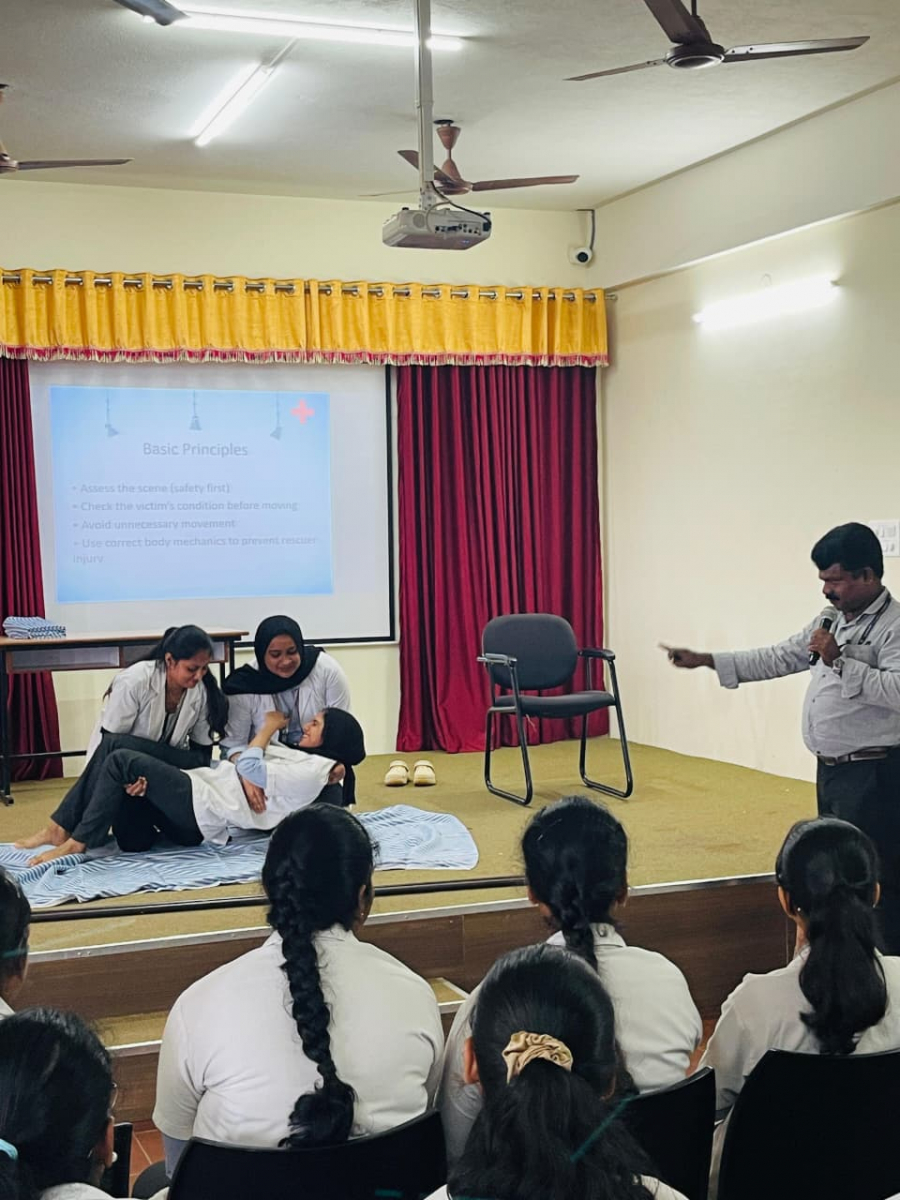 The first session, led by Ms. Daisy D'Souza, Assistant Professor, Yenepoya Nursing College, focused on CPR and choking management, including practical demonstrations. The second session, conducted by Dr. Harinarayana A., Professor and YRC Programme Officer, Yenepoya Homeopathic Medical College, covered safe patient handling and transportation techniques.